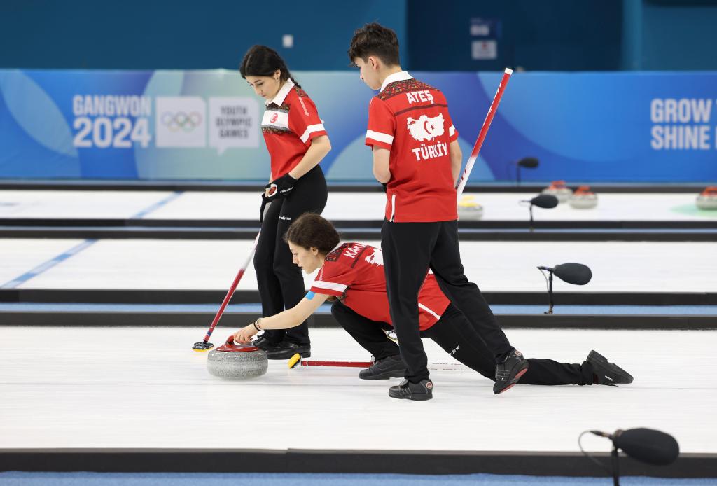 1月20日,土耳其隊(duì)隊(duì)員在冰壺混合團(tuán)體項(xiàng)目的比賽中。新華社記者 胡虎虎 攝