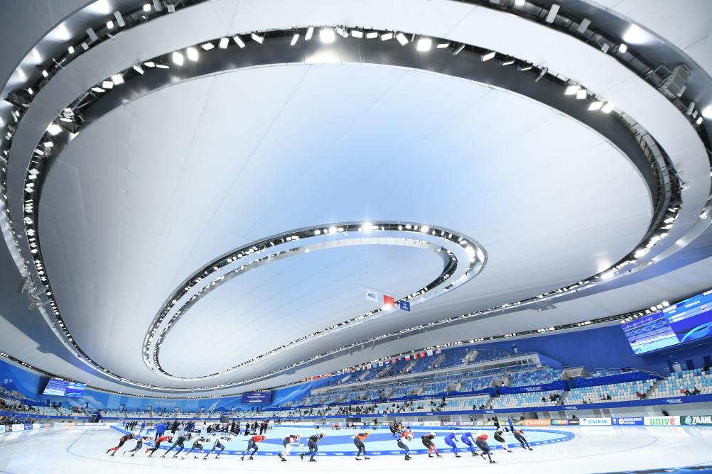2023年11月19日,參賽選手在2023-2024賽季國際滑聯(lián)速度滑冰世界杯(北京站)男子集體出發(fā)A組比賽中。新華社記者 鞠煥宗 攝