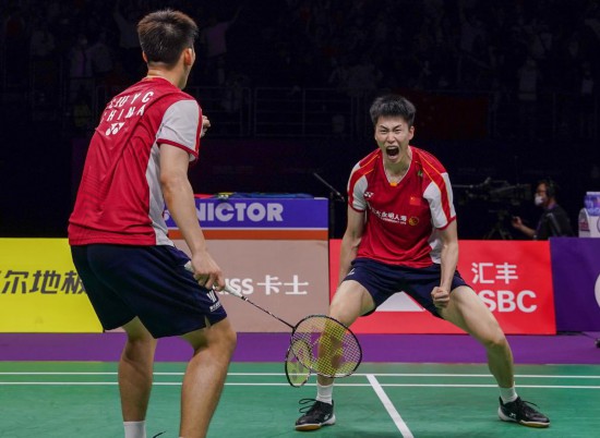 2023年5月20日,中國(guó)隊(duì)組合劉雨辰/歐烜屹(右)在2023年蘇迪曼杯世界羽毛球混合團(tuán)體錦標(biāo)賽半決賽男雙比賽后慶祝。新華社記者李博攝