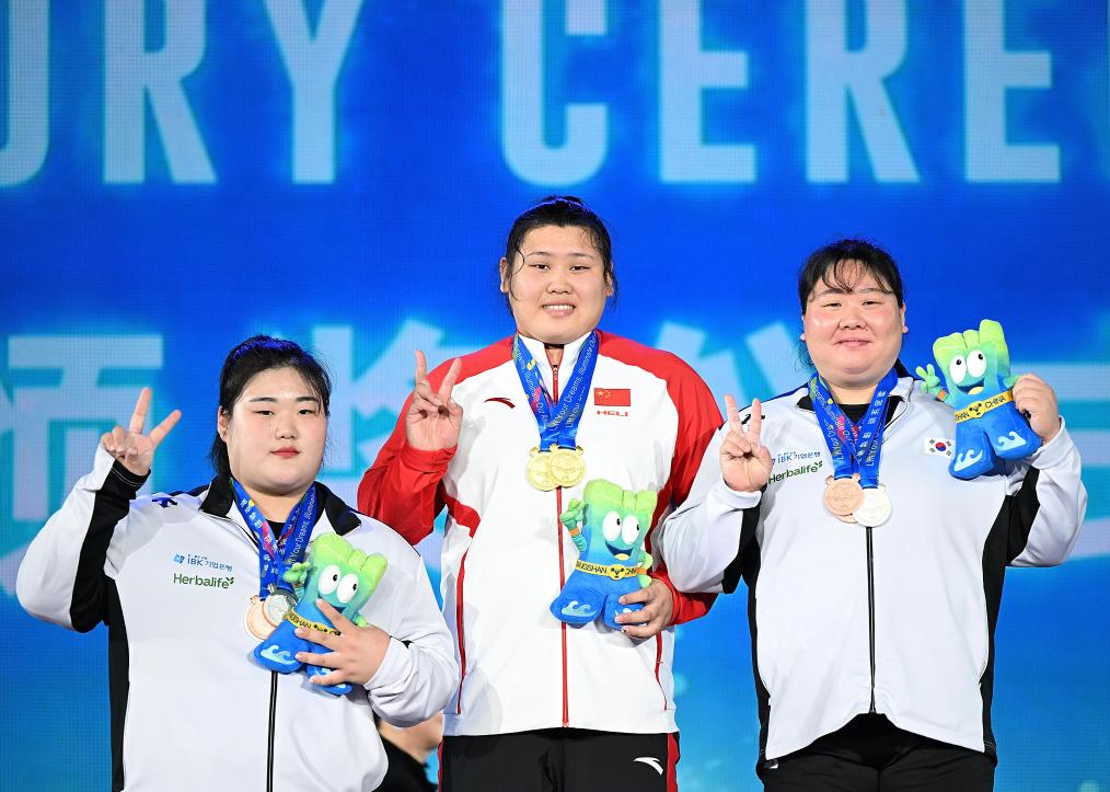 5月15日,總成績冠軍中國選手李閆(中)、亞軍韓國選手樸惠正(左)和季軍韓國選手孫永熙在頒獎儀式上合影。新華社記者 侯昭康 攝 在女子87公斤以上級比賽中,曾獲杭州亞運會冠軍、巴黎奧運會亞軍的韓國選手樸惠正等好手出戰(zhàn),中國隊派出世錦賽冠軍李閆?!按蠹页煽兒孟癫畈欢啵俏腋杏X我比她們厲害一點?!崩铋Z說。 李閆的自信建立在實力之上。抓舉階段她最后出場,第一次試舉就鎖定金牌。她的抓舉最終成績?yōu)?40公斤,超第二名樸惠正15公斤。樸惠正的隊友孫永熙獲得抓舉銅牌。