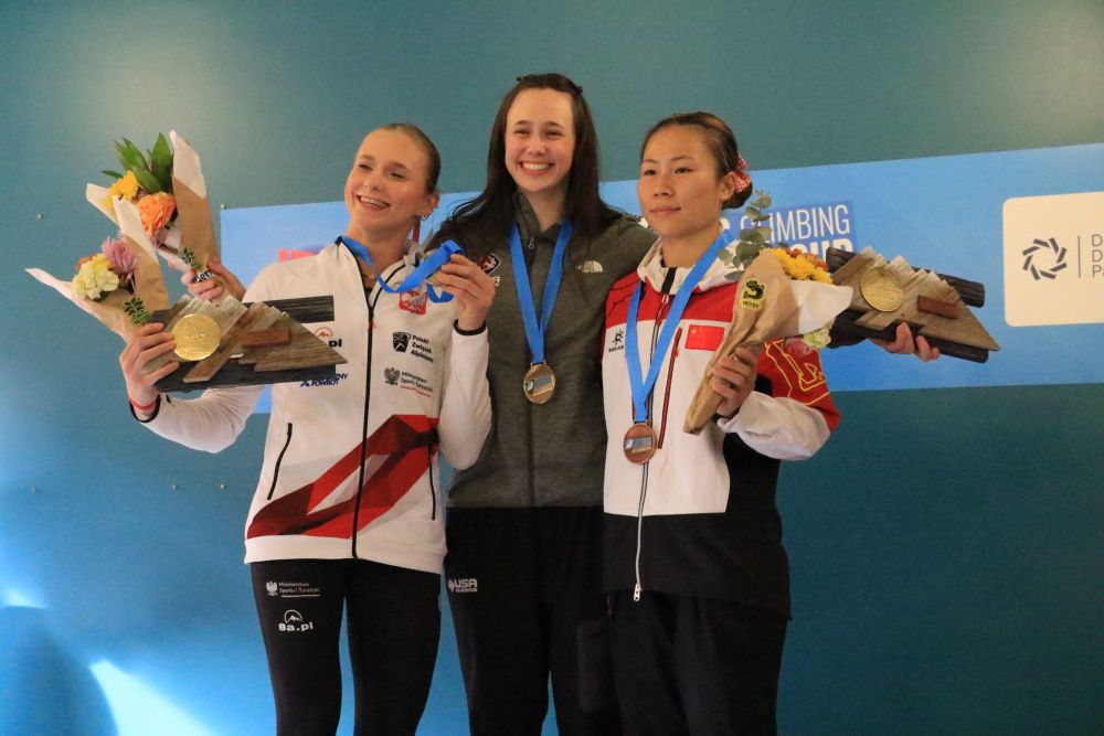 女子前三名在頒獎(jiǎng)儀式上,右一為鄧麗娟。中國(guó)國(guó)家攀巖隊(duì)供圖