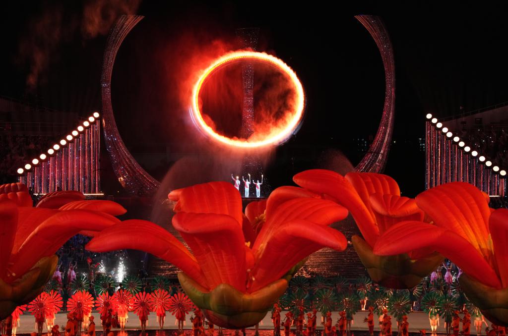 新華社廣州11月10日電(記者王浩明、趙紫羽、田宇)9日晚,廣東奧林匹克體育中心,十五運(yùn)會(huì)的開(kāi)幕式在這里舉行,當(dāng)十五運(yùn)會(huì)主火炬塔“天海之冠”被三地健兒共同點(diǎn)亮那一剎,燈火輝煌,掌聲雷動(dòng)。