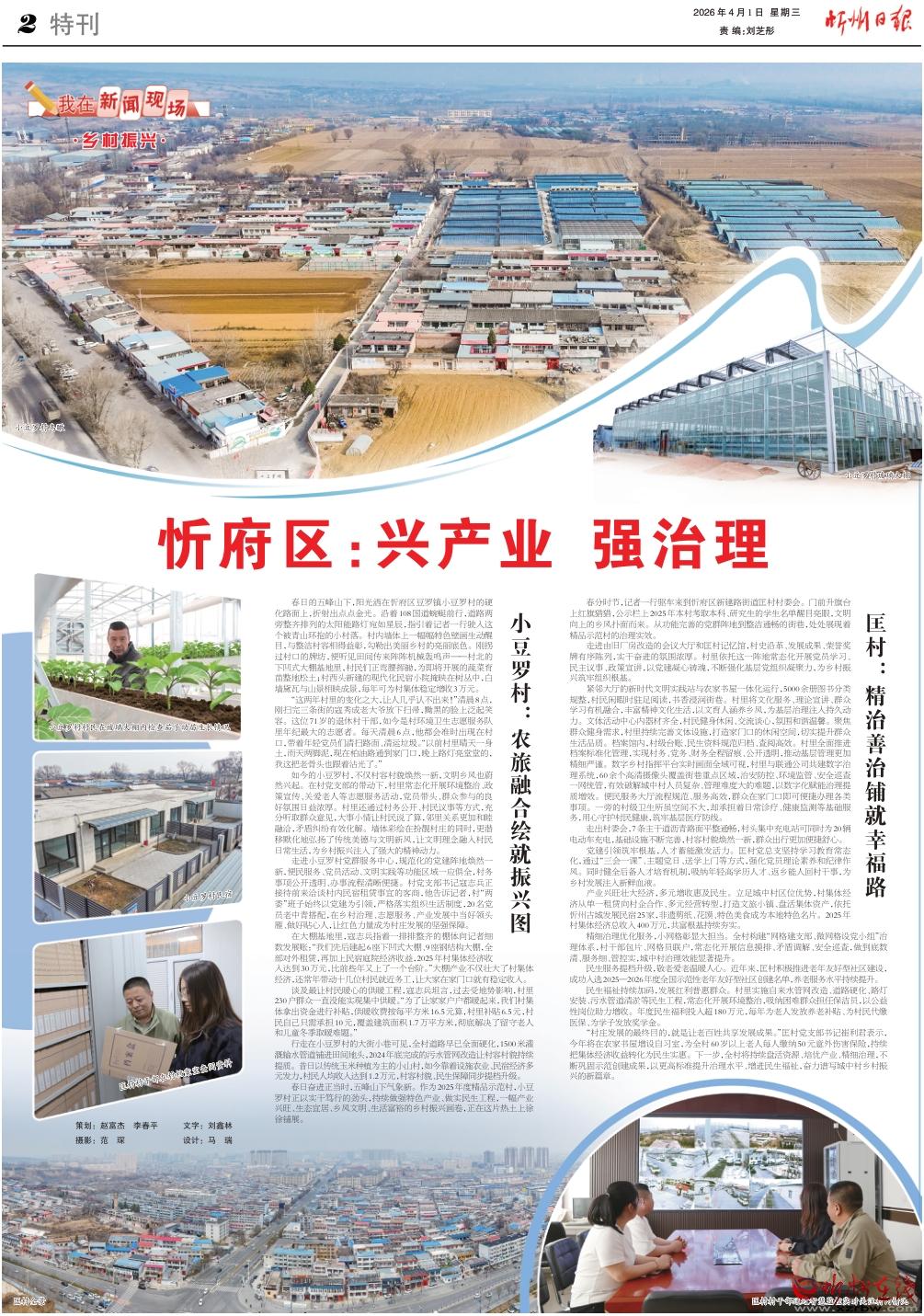 春日的五峰山下,陽(yáng)光灑在忻府區(qū)豆羅鎮(zhèn)小豆羅村的硬化路面上,折射出點(diǎn)點(diǎn)金光。沿著108國(guó)道蜿蜒前行,道路兩旁整齊排列的太陽(yáng)能路燈宛如星辰,指引著記者一行駛?cè)脒@個(gè)被青山環(huán)抱的小村落。村內(nèi)墻體上一幅幅特色壁畫生動(dòng)醒目,與整潔村容相得益彰,勾勒出美麗鄉(xiāng)村的亮麗底色。剛拐過村口的牌坊,便聽見田間傳來(lái)陣陣機(jī)械轟鳴聲——村北的下凹式大棚基地里,村民們正彎腰揮鋤,為即將開展的蔬菜育苗整地松土;村西頭新建的現(xiàn)代化民宿小院掩映在樹叢中,白墻黛瓦與山景相映成景,每年可為村集體穩(wěn)定增收3萬(wàn)元。