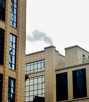 城區(qū)云中路瑞新裝飾城對(duì)面,有兩個(gè)煙囪冒煙,污染環(huán)境。城區(qū)七一路臨街一酒店樓頂有煙不斷冒出,而且味道嗆人。希望商戶(hù)或住戶(hù)配合治理,共同營(yíng)造碧水藍(lán)天的良好環(huán)境。12月9日網(wǎng)友攝