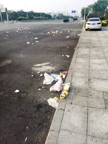 城區(qū)高鐵廣場(chǎng)前,慕山路與雁門大道丁字路口,每天晚上有小商販在此經(jīng)營(yíng),本無(wú)可厚非,但每天產(chǎn)生的垃圾,既影響市容環(huán)境,還給環(huán)衛(wèi)工人增加了工作量,呼吁市民及小商販愛(ài)護(hù)環(huán)境,也希望相關(guān)部門管理維護(hù)公共環(huán)境。一網(wǎng)友攝于8月22日