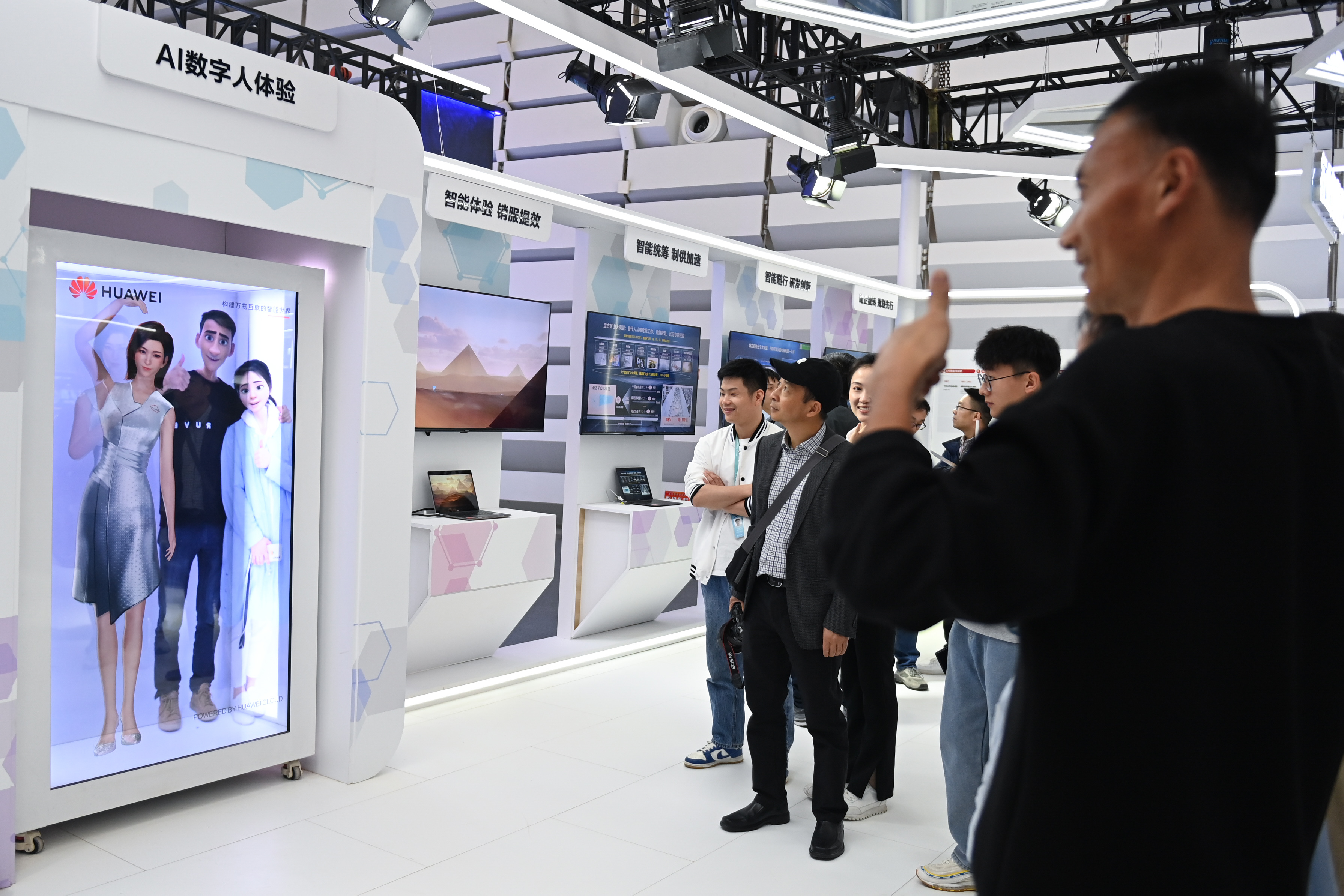 觀眾在華為展臺(tái)體驗(yàn)與AI數(shù)字人合影。新華社記者 黃宗治 攝