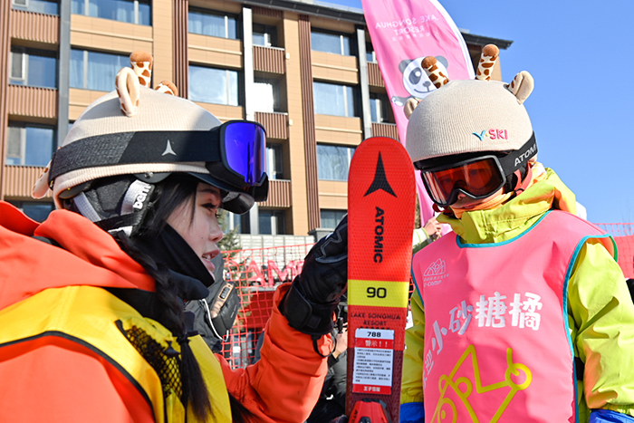 1月8日,滑雪教練在吉林市萬(wàn)科松花湖度假區(qū)向來(lái)自廣西南寧的“砂糖橘”小朋友講解滑雪知識(shí)。新華社記者 顏麟蘊(yùn) 攝