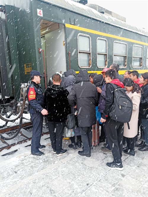 1月5日,五寨縣普降大雪。五寨火車站派出所民警冒雪維護秩序,指揮疏導交通,確保旅客在客流高峰期安全乘車。(索效剛 攝)