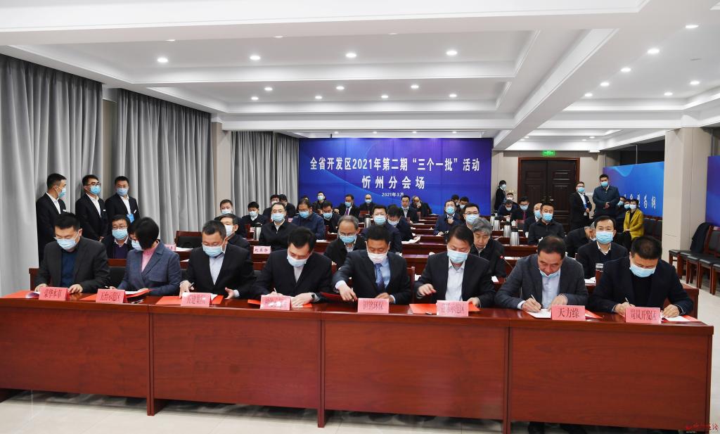 忻州分會(huì)場(chǎng)。劉紀(jì)森 攝 本報(bào)訊 (記者楊峰雷)3月22日,全省開發(fā)區(qū)2021年第二期項(xiàng)目集中簽約一批、開工一批、投產(chǎn)一批“三個(gè)一批”活動(dòng)通過視頻連線方式舉行,進(jìn)一步掀起項(xiàng)目建設(shè)高潮,我市作為分會(huì)場(chǎng)同步舉行相關(guān)活動(dòng)。市委書記鄭連生在忻州分會(huì)場(chǎng)出席并匯報(bào)工作,市委副書記、市長(zhǎng)朱曉東主持忻州分會(huì)場(chǎng)簽約儀式。市委常委、秘書長(zhǎng)崔建新,副市長(zhǎng)范建民在忻州分會(huì)場(chǎng)出席。