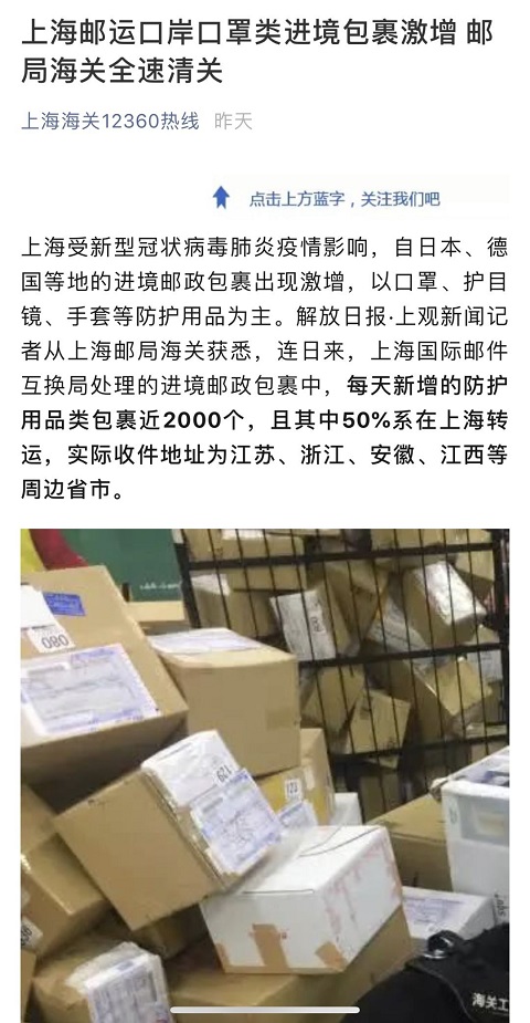 (上海郵運口岸口罩類進境包裹激增 郵局海關(guān)全速清關(guān))
