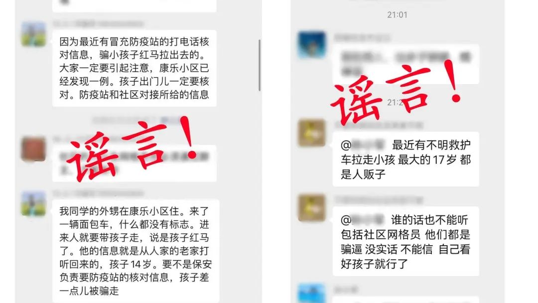 近日,本地微信群傳播:“最近有冒充防疫站的打電話核對(duì)信息,騙小孩紅馬拉出去的。大家一定要引起注意,康樂小區(qū)已經(jīng)發(fā)現(xiàn)一例”、“最近有不明救護(hù)車?yán)咝『?,最大?7歲,都是人販子”。