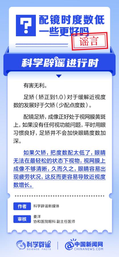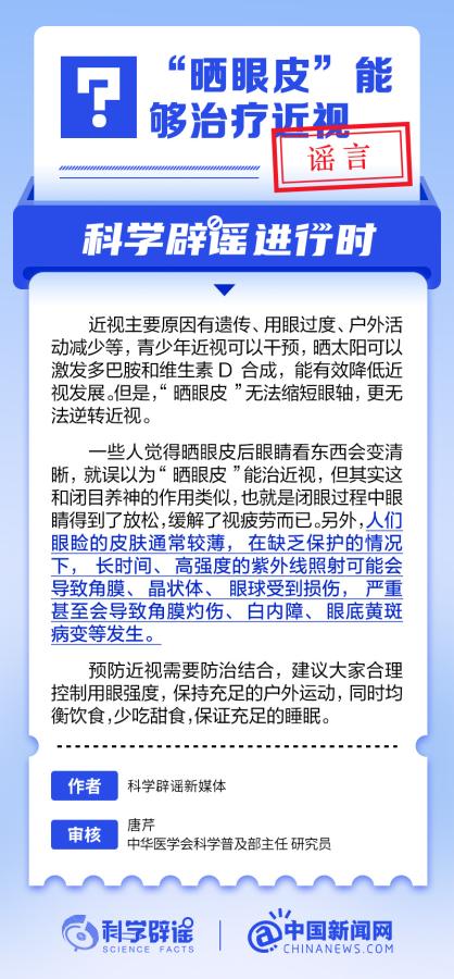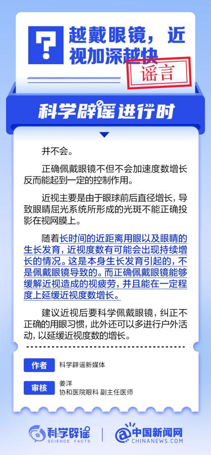 中新網6月6日電 6月6日是全國愛眼日。隨著大家越來越重視護眼,人們開始自發(fā)地從網上查找一些護眼知識,與此同時,網上也出現了很多的護眼誤區(qū)。有哪些常見的所謂“護眼知識”其實是誤區(qū)?眼鏡度數配高點好還是配低點好?詳情↓ (來源:@科學辟謠 中國新聞網微博)