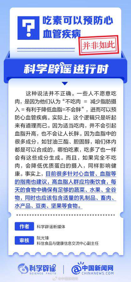 一些人不愿意吃肉,是因?yàn)樗麄冋J(rèn)為“不吃肉=減少脂肪攝入=有利于降低血脂=不會(huì)胖”,進(jìn)而可以預(yù)防心血管疾病。實(shí)際上,這個(gè)邏輯只是聽起來有道理而已。因?yàn)檫m當(dāng)吃肉,并不會(huì)引起血脂升高,也不會(huì)讓人長胖。如果完全不吃肉,會(huì)降低優(yōu)質(zhì)蛋白的攝入,同樣影響健康。(來源:@科學(xué)辟謠 中國新聞網(wǎng)微博)