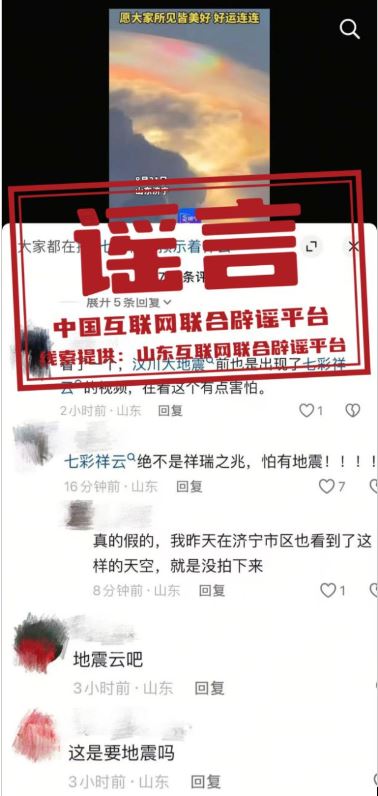 謠言:山東濟寧出現(xiàn)“祥云”為地震前兆?