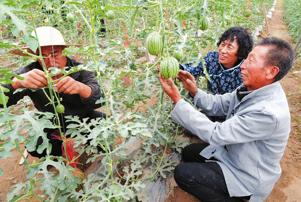 6月3日,在大同市新榮區(qū)堡子灣鄉(xiāng)得勝堡村吊瓜西瓜日光溫室內(nèi),農(nóng)民胡明、劉轉(zhuǎn)林正在對吊瓜西瓜進(jìn)行維護(hù)。今年以來,得勝堡村因地制宜,建設(shè)日光溫室6棟,共計(jì)13560平方米,助推得勝堡村易地搬遷后續(xù)產(chǎn)業(yè)“高效種植園區(qū)+鄉(xiāng)村旅游”“大棚設(shè)施產(chǎn)業(yè)+鄉(xiāng)村旅游產(chǎn)業(yè)”等模式快速發(fā)展,走出了一條產(chǎn)業(yè)富民強(qiáng)村之路。(山西日報(bào)記者劉通 山西日報(bào)通訊員陳榮燁攝
