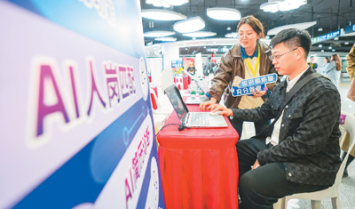 日前,在福建省福州市鼓樓區(qū)安泰街道南門兜地鐵站里舉行的2025年就業(yè)援助月專項活動中,工作人員利用AI技術(shù)和大數(shù)據(jù)分析等先進技術(shù),為求職者提供智能化的崗位匹配和職業(yè)規(guī)劃建議。謝貴明攝(人民視覺)