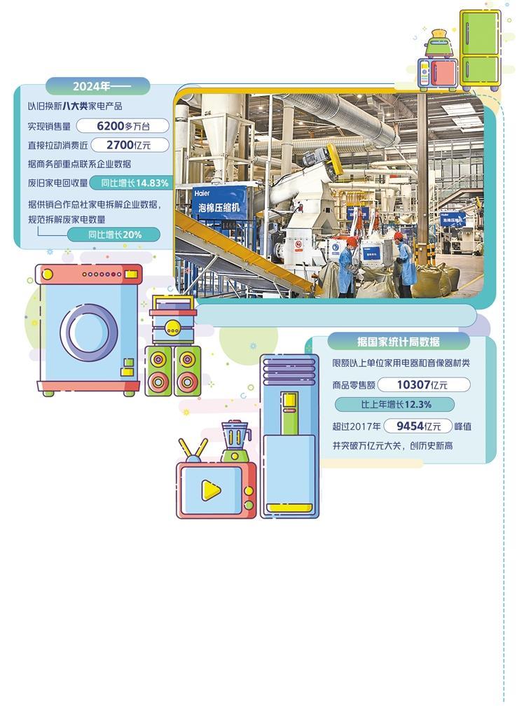 自《推動大規(guī)模設(shè)備更新和消費品以舊換新行動方案》(以下簡稱《行動方案》)實施以來,家電市場消費潛力得到顯著釋放。數(shù)據(jù)顯示,2024年,中央加力支持以舊換新八大類家電產(chǎn)品實現(xiàn)銷售量6200多萬臺,直接拉動消費近2700億元。日前,國家發(fā)展改革委副主任趙辰昕在國務(wù)院政策例行吹風(fēng)會上介紹,2025年將延續(xù)并加力擴圍實施“兩新”政策,享受以舊換新補貼的家電產(chǎn)品種類由2024年的8類增至12類,單件最高補貼可達銷售價格的20%。