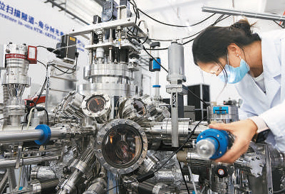 圖為科研人員在綜合極端條件實驗裝置(懷柔)低溫原位掃描隧道—角分辨光電子譜實驗站放置實驗樣品。新華社記者 金立旺攝