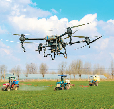 3月16日,山東青島萊西市沽河街道,植保無人機(jī)、長臂噴霧機(jī)在田間對小麥進(jìn)行管護(hù)。張進(jìn)剛攝(人民視覺)