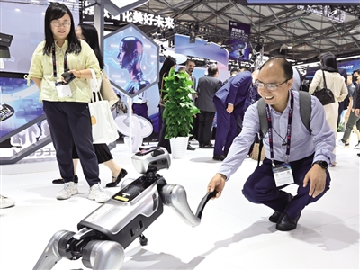 6月18日,觀(guān)眾在2025年世界移動(dòng)通信大會(huì)(上海)中國(guó)電信展臺(tái)與智能機(jī)器狗互動(dòng)。 記者 陳愛(ài)平 攝