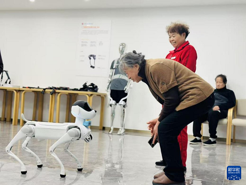 浙江烏鎮(zhèn)智能養(yǎng)老中心內(nèi),院內(nèi)老人正與機器狗互動。新華網(wǎng)發(fā)(鐘月英 攝)