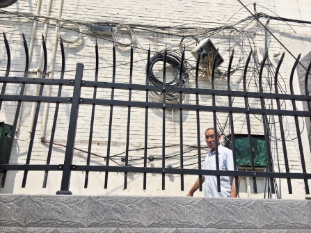 記者在位于該路口的市化工局宿舍樓側(cè)面墻上看到布滿“蛛網(wǎng)”般的電線,藕斷絲連,錯(cuò)綜復(fù)雜。小區(qū)住戶劉大爺告訴記者,這堵墻上的電線種類繁多復(fù)雜,最要緊的是其中的高壓電線固定在距離地面只有1米至1.5米左右的墻上,電線外面的PVC保護(hù)管已經(jīng)因年久失修嚴(yán)重老化,電線直接裸露在外,遇上下雨打雷天氣非常危險(xiǎn),平時(shí)小孩玩耍路過(guò)也不安全。據(jù)記者觀察,在距離這堵墻約兩米的地方有1根電線桿,宿舍樓墻上離地面最近的4根黑色電線就是從這根電桿上接進(jìn)來(lái)的,電線橫搭部分基本暴露在外,特別不安全。小區(qū)居民希望相關(guān)部門能夠盡快消除隱患,給居民們一個(gè)安全放心的居住環(huán)境。