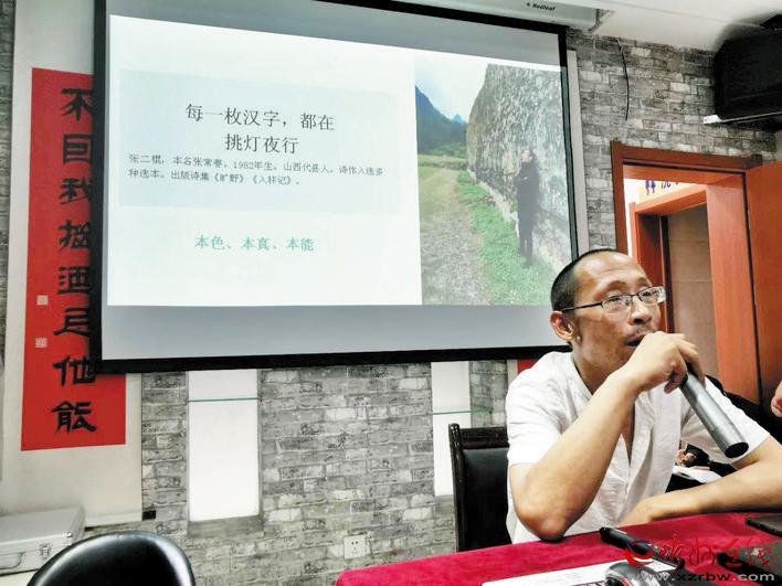本報(bào)訊 8月15日晚,位于忻州市七一北路的好目匠眼鏡店迎來(lái)一場(chǎng)文學(xué)盛會(huì)。保德縣、岢嵐縣、五寨縣、原平市、定襄縣的詩(shī)歌愛(ài)好者,與忻州城區(qū)的詩(shī)歌愛(ài)好者一起聆聽(tīng)了著名詩(shī)人張二棍關(guān)于詩(shī)歌創(chuàng)作的講座,甚至有詩(shī)歌愛(ài)好者專(zhuān)門(mén)從北京趕回忻州。當(dāng)晚,連講座廳外都站滿了聆聽(tīng)的人。