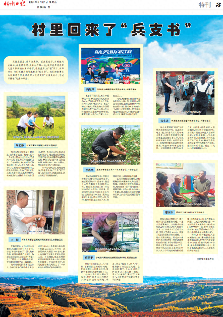 支部是堡壘,黨員當先鋒。在發(fā)展經(jīng)濟、鄉(xiāng)村振興主戰(zhàn)場,在基層治理、農(nóng)業(yè)生產(chǎn)第一線,我市優(yōu)秀退役軍人黨員積極響應(yīng)國家號召,扎根基層,向“新”而立、向陽而行,他們被群眾親切地稱為“兵支書”。他們的故事生動地彰顯了既是退役軍人又是黨員“點滴見初心,忠誠不褪色”的先鋒形象。