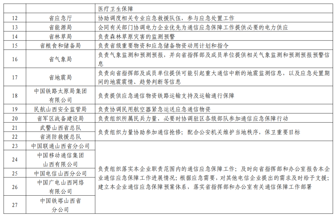 成員:省通信管理局、省委宣傳部、省委網(wǎng)信辦、省發(fā)展改革委、省公安廳、省財政廳、省自然資源廳、省交通廳、省水利廳、省衛(wèi)健委、省應急廳、省能源局、省林草局、省糧食和儲備局、省氣象局、省地震局、中國鐵路太原局集團有限公司、民航山西安全監(jiān)管局、省軍區(qū)戰(zhàn)備建設(shè)局、武警山西省總隊、省消防救援總隊以及省基礎(chǔ)電信企業(yè)等部門單位相關(guān)負責人。