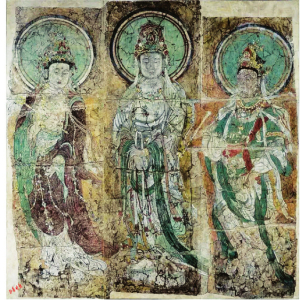 在中國廳中央墻上有幾十平方米的敦煌壁畫,其割痕雖猶可見,卻難掩其久遠(yuǎn)的鮮麗及三位“濃麗豐肥”菩薩的雍容華貴。