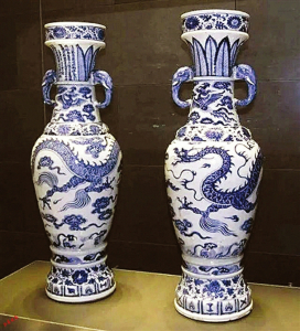 大維德花瓶可能是現(xiàn)存最重要的青花瓷器物,其頂部附近的銘文表明它們的年代可以追溯到1351年。1935年,珀西瓦爾·大維德爵士分別從兩個收藏家手中買下它們,令這對花瓶重聚。