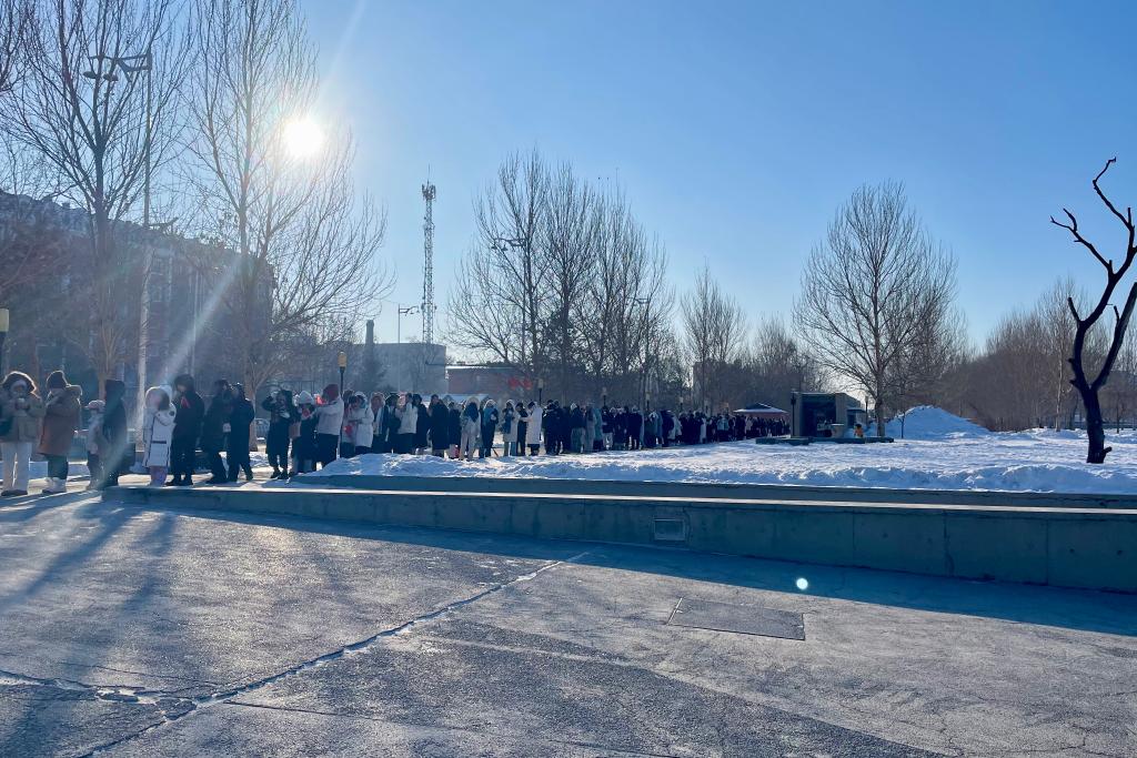 9日早上,哈爾濱氣溫低至零下20攝氏度,陳列館外早已排起長隊(duì)。為了迎接高峰,陳列館延長開放時(shí)間,游客通過網(wǎng)上預(yù)約可免費(fèi)入館參觀,還有志愿者送上熱水或玉米糊幫他們驅(qū)寒。