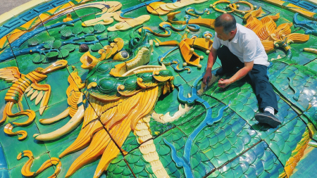4月22日,國家級非遺項目琉璃燒制技藝傳承人劉開寶將制作的琉璃制品“麒麟獻端”交付客戶。