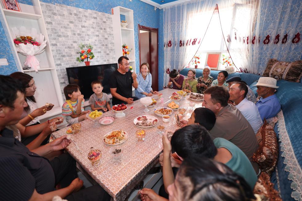 6月30日,烏什縣亞曼蘇柯爾克孜族鄉(xiāng)尤喀克亞曼蘇村居民吐爾洪·艾買提一家搬進新房,親朋好友趕來慶賀。新華社發(fā)(楊碩 攝)