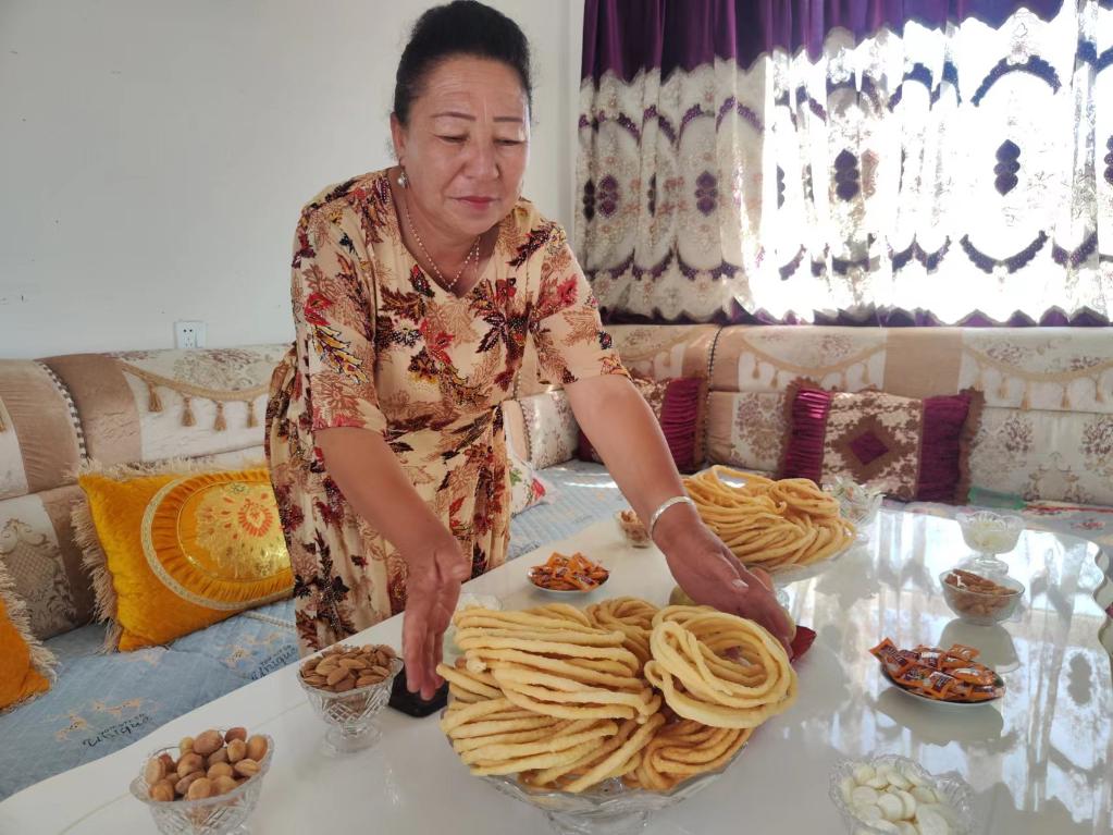 6月30日,烏什縣亞曼蘇柯爾克孜族鄉(xiāng)尤勒吐孜布拉克村居民阿曼古麗·熱合曼正在新居里準備茶點。新華社記者 關(guān)俏俏 攝