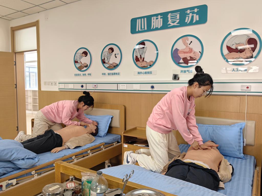 2024年9月25日,山東女子學(xué)院養(yǎng)老服務(wù)管理專(zhuān)業(yè)學(xué)生在練習(xí)心肺復(fù)蘇。新華社記者張力元 攝
