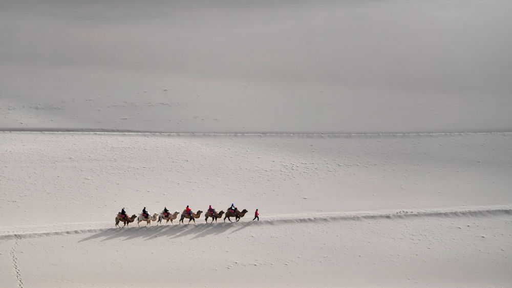 駝隊(duì)載著游客行走在鳴沙山月牙泉景區(qū)的駝道上(2023年4月24日攝)。新華社記者 陳斌 攝
