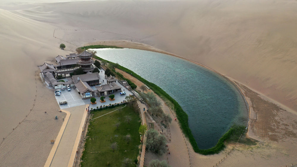這是敦煌鳴沙山北麓的月牙泉(2023年6月7日攝,無人機(jī)照片)。新華社記者 張智敏 攝