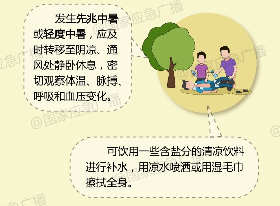 使中暑者在陰涼通風處平臥,抬高下肢,及時快速降溫、補糖鹽水,謹防低血壓,保證重要臟器血供,盡快送醫(yī)。