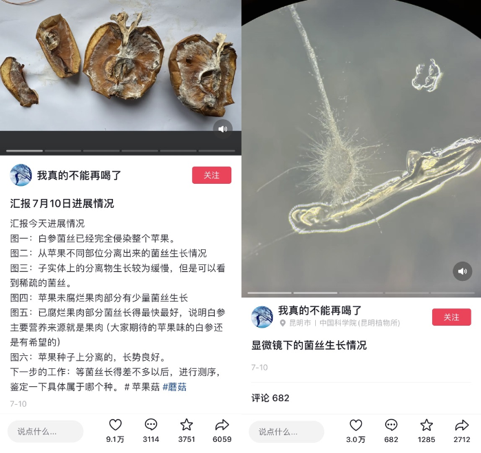 拿到樣本后,許博士對蘋果做了切片觀察,還在抖音上向網(wǎng)友實時更新起了菌絲生長情況,引發(fā)越來越多網(wǎng)友的“追更”。之后又有科普創(chuàng)作者@植物眼 專門采訪許博士的導(dǎo)師趙琪,他的細(xì)致講解讓很多網(wǎng)友紛紛表示“又學(xué)到了新知識”。