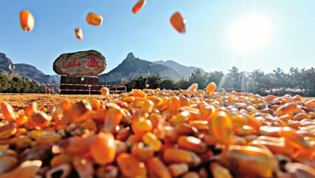 從空中俯瞰,景區(qū)標(biāo)志性的刻有“藏山”字樣的巨石,被連片的玉米“花海”環(huán)繞,綿延千米的道路上,玉米粒被村民們精心鋪成整齊的波紋狀,宛如一條流淌的金色長(zhǎng)河。“今年景區(qū)把這么寬的路讓給我們晾曬糧食,真的解決了我們一大難題!”正在翻曬玉米的村民李師傅說(shuō)道。