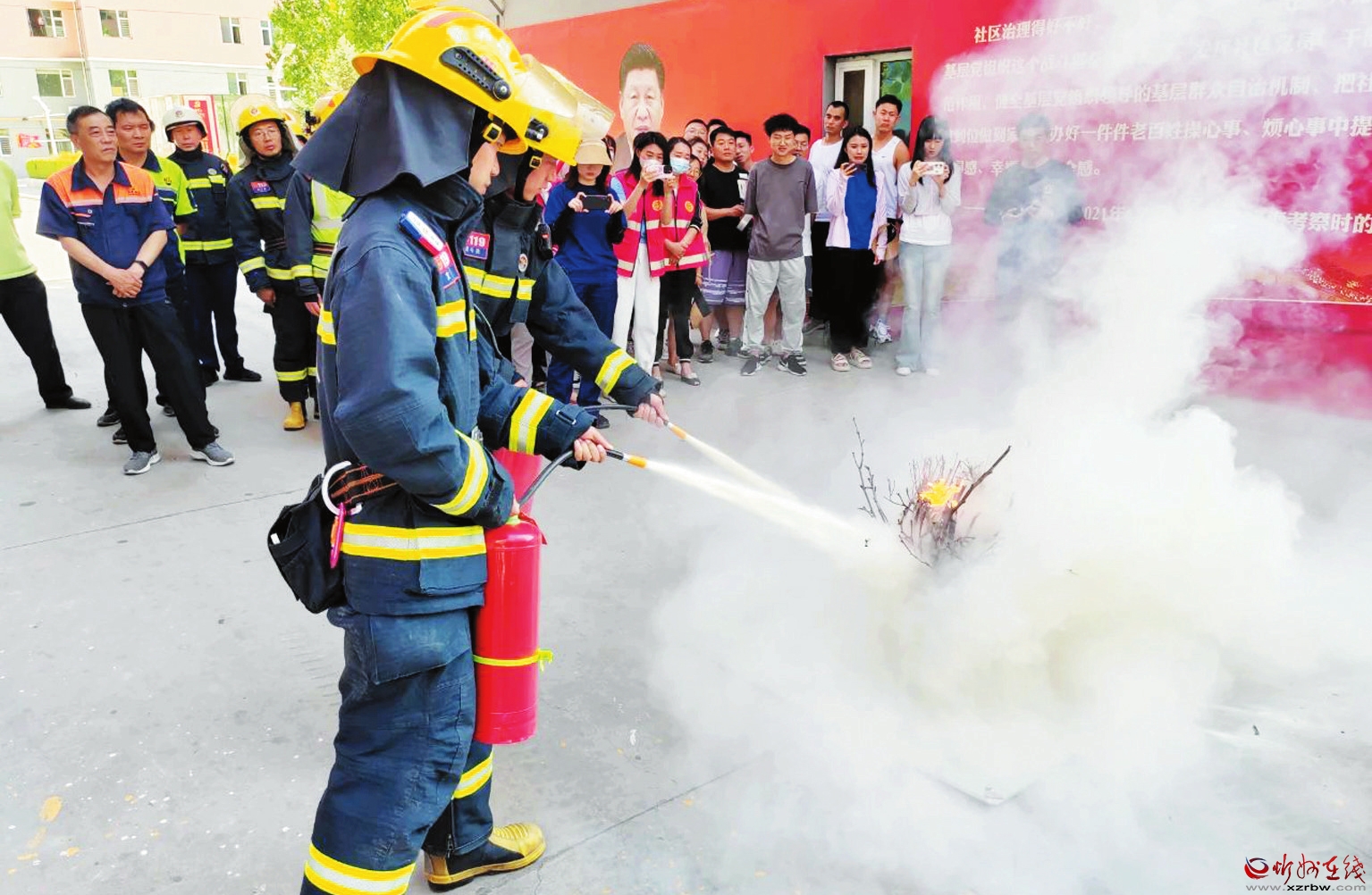 為推進落實消防安全的源頭治理,進一步提升小區(qū)業(yè)主和物業(yè)工作人員的消防安全知識及應(yīng)對火災(zāi)突發(fā)事件能力,近日,原平市消防救援大隊聯(lián)合北城街道辦事處在該市迎賓小區(qū)開展消防演練。期間,結(jié)合近年來的高層建筑電氣火災(zāi)案例,消防人員對火場疏散逃生的基本常識、火災(zāi)的應(yīng)急和預(yù)防、消防器材的使用方法進行講解,引導(dǎo)小區(qū)物業(yè)工作人員和業(yè)主拿起滅火器進行實際操作,切實了解和掌握滅火器的正確使用方法,進一步增強轄區(qū)群眾應(yīng)急防范能力和安全意識。圖為正確使用滅火器演示現(xiàn)場。(劉 強攝)