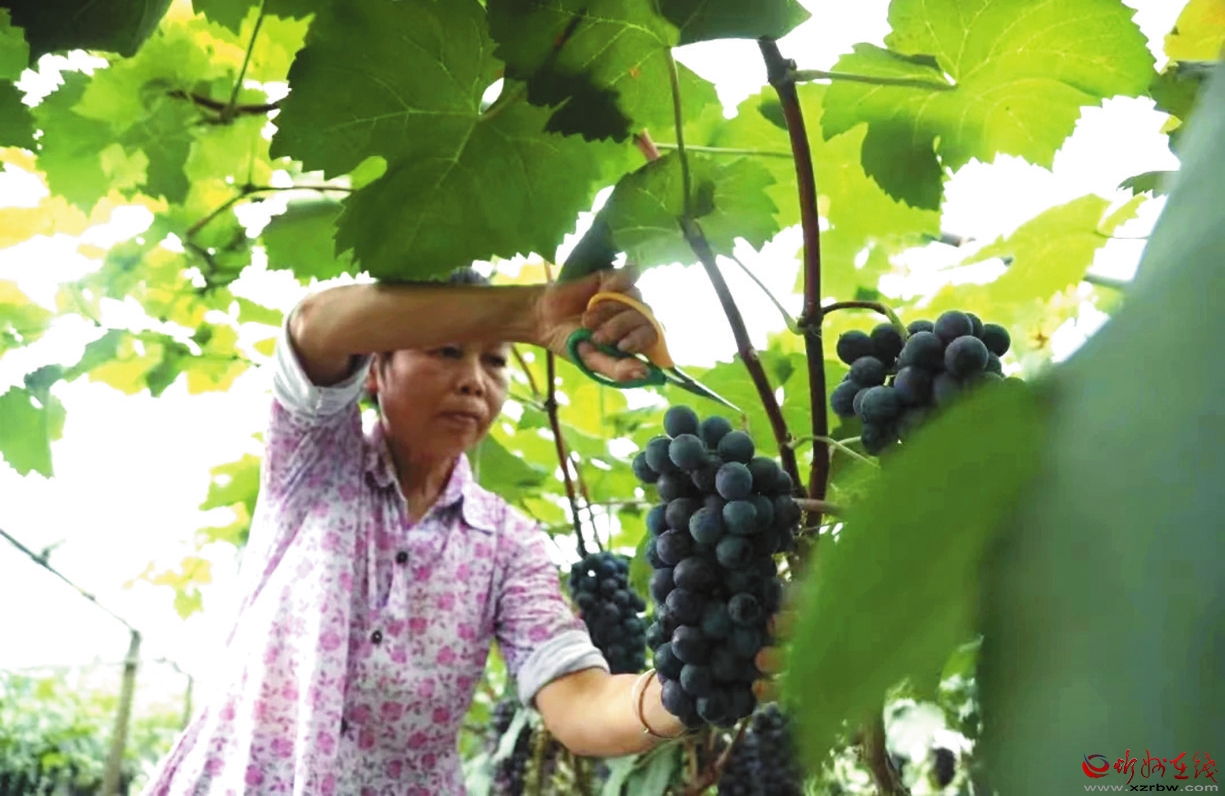 走進葡萄大棚,一排排葡萄架整整齊齊,架上綴滿的,便是今天的主角——“夏黑”葡萄了。只見一串串珠圓玉潤、晶瑩剔透的葡萄,沉甸甸地掛滿枝頭,讓人垂涎欲滴。沿著畦間往里,一串串葡萄迎面而來,像一場盛大的表演,你方唱罷我登場,像珠寶店價值連城的上等珍珠,爭著奇、斗著艷,又像棲在枝頭上的鳥雀們,嘰嘰喳喳地聊個不?!r(nóng)正帶著游客們采摘,大家左看看、右看看,相中了就剪下來裝箱。閑聊間,隨手摘下來一顆丟進口中:真甜!