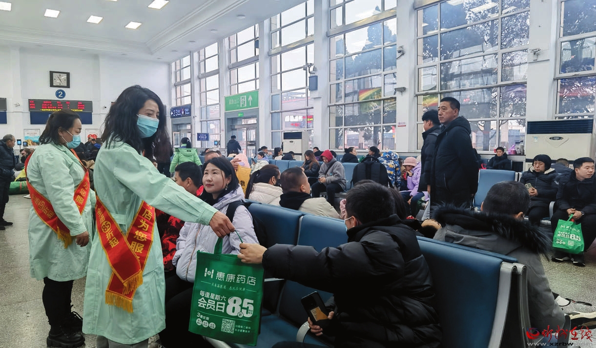 近日,國內(nèi)知名藥企廣州白云山和記黃埔中藥有限公司攜手我市當?shù)厮幤箝_展春運愛心公益活動。圖為工作人員在忻州火車站向候車乘客發(fā)放防流感藥品、口罩等健康禮包。(李建中攝)