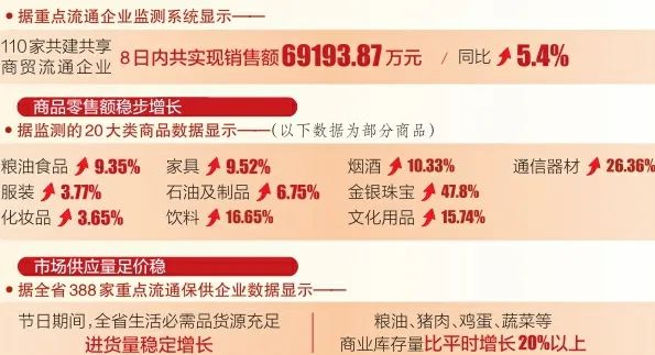 商品零售額穩(wěn)步增長。各市結(jié)合消費(fèi)者追求綠色健康、彰顯個性多樣、青睞科技智能等方面的消費(fèi)新需求,通過發(fā)放政府電子消費(fèi)券或指導(dǎo)商圈集聚營銷、品牌商品展銷、特色商品促銷等形式,持續(xù)拉動消費(fèi)增長。據(jù)了解,全省各大商場節(jié)日禮盒、時令水果、糖果糕點、地方土特產(chǎn)、健康保健品、牛奶、飲料、煙酒等銷售旺盛。據(jù)監(jiān)測的20大類商品數(shù)據(jù)顯示,糧油食品、服裝、化妝品、家具、石油及制品同比分別增長9.35%、3.77%、3.65%、9.52%和6.75%;飲料、煙酒、金銀珠寶、文化用品、通信器材等實現(xiàn)了兩位數(shù)以上的增長,分別為16.65%、10.33%、47.8%、15.74%和26.36%。