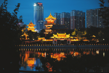 6月9日晚,太原市迎澤公園內(nèi)的仿古建筑流光溢彩,宛若仙境。范文靜攝