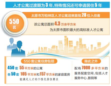 太原市高度重視人才工作,大力實(shí)施人才強(qiáng)市戰(zhàn)略,不斷創(chuàng)新人才政策,優(yōu)化人才生態(tài),為各類人才提供廣闊的發(fā)展舞臺。作為太原市的核心城區(qū),萬柏林區(qū)搶抓打造人才高地的重大機(jī)遇,精心建設(shè)拎包入住、設(shè)施齊全、服務(wù)優(yōu)質(zhì)的高品質(zhì)人才公寓。550套公寓住房包括450套55平方米的公寓、105平方米和157平方米的家庭套房各50套,能滿足人才的個(gè)性化居住要求。除此之外,還配有7000多平方米的服務(wù)配套空間,包括人才服務(wù)中心、影院、餐廳、書吧、健身房、創(chuàng)客空間等。