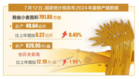 本報(bào)訊(記者王秀娟)7月12日,國家統(tǒng)計(jì)局發(fā)布2024年夏糧產(chǎn)量數(shù)據(jù),我省小麥面積791.85萬畝;總產(chǎn)49.64億斤,比上年增加0.22億斤,增長0.45%;單產(chǎn)626.95斤/畝,創(chuàng)歷史新高,比上年增加12.19斤/畝,增長1.98%。