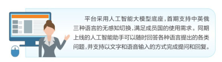 該平臺采用人工智能大模型底座,首期支持中英俄三種語言的無感知切換,滿足成員國的使用需求。同期上線的人工智能助手可以隨時回答各種語言提出的各類問題,并支持以文字和語音輸入的方式完成提問和回復。二期平臺更新后,將實現(xiàn)產業(yè)標簽、企業(yè)和產品的自動推薦功能,人工智能在用戶注冊后,可為用戶自動生成和匹配目標企業(yè)與目標產品,優(yōu)化用戶體驗。