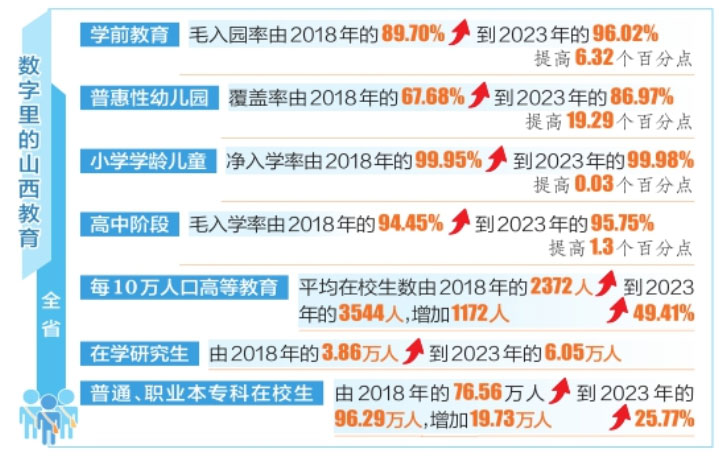 全省普惠性幼兒園覆蓋率從2020年的84.83%提高至2023年的86.97%,其中大同市達(dá)到96.63%,位列全省第一;學(xué)前教育毛入園率從2020年的90.8%提高至2023年的96.02%,高出全國(guó)平均水平4.92個(gè)百分點(diǎn)。小學(xué)、初中學(xué)齡兒童凈入學(xué)率分別保持在99.95%、99.66%以上,高中階段毛入學(xué)率2023年提升至95.75%,并率先實(shí)現(xiàn)20萬人口以上的縣特殊教育學(xué)校全覆蓋,控輟保學(xué)從動(dòng)態(tài)清零轉(zhuǎn)向常態(tài)清零,“有學(xué)上”問題得到全面解決。